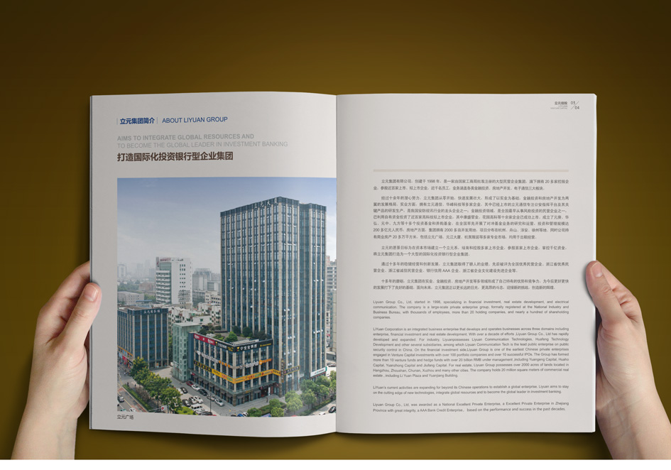 立元集團創建于1998年,旗下擁有20多家控股企業,參股近百家上市、擬上市企業,近千名員工,業務涵蓋各類金融投資、房地產開發、電子通信三大板塊。銘陽廣告公司先后為其提供集團宣傳冊設計、團隊攝影、資本投資畫冊設計、員工手冊設計制作、物業公司宣傳設計、大型主題會議設計、PPT設計等。